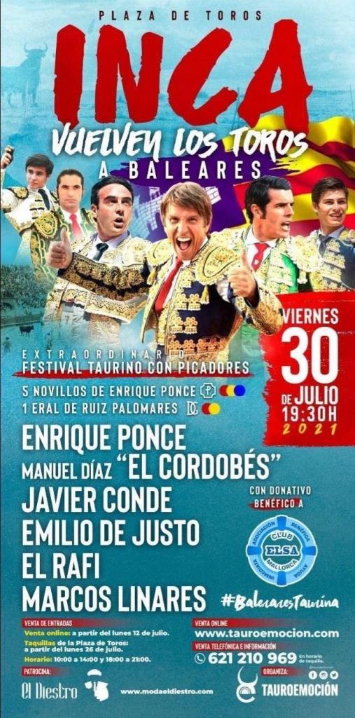 El Rafi a été annoncé en Festival à Inca sur l’île de Majorque aux Baléares, le vendredi 30 juillet aux côtés des figuras Enrique Ponce, Manuel Diaz El Cordobés, Javier Conde, Emilio de Justo et du novillero Marcos Linares face à des novillos d’Enrique Ponce et un eral de Ruiz Palomares.