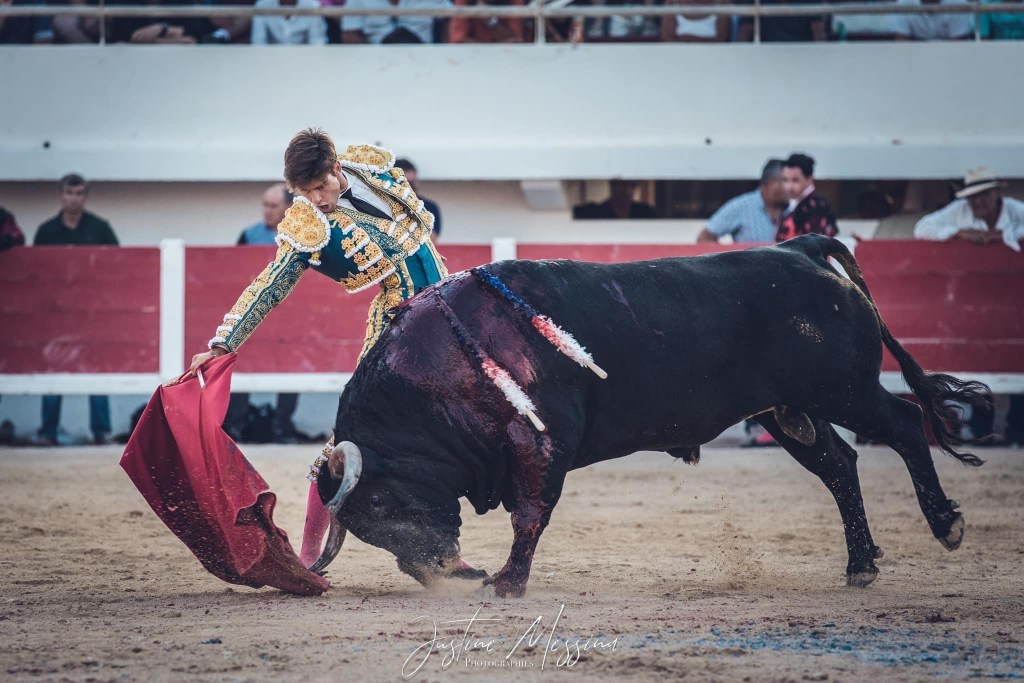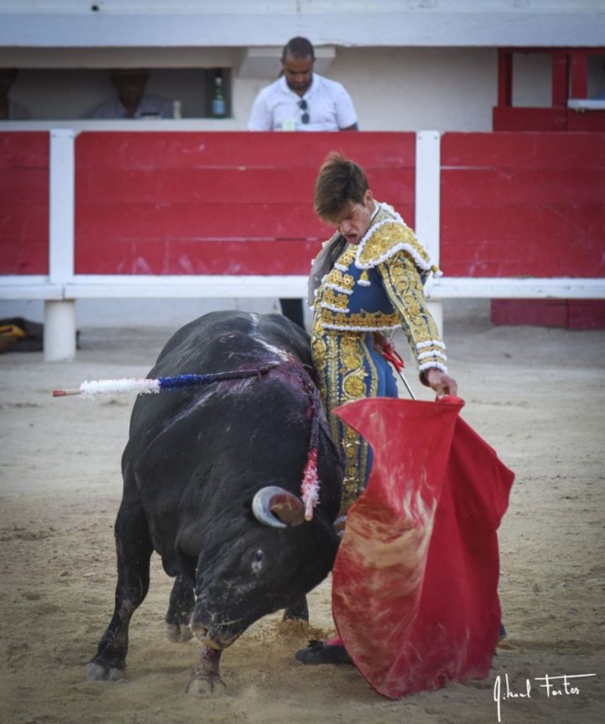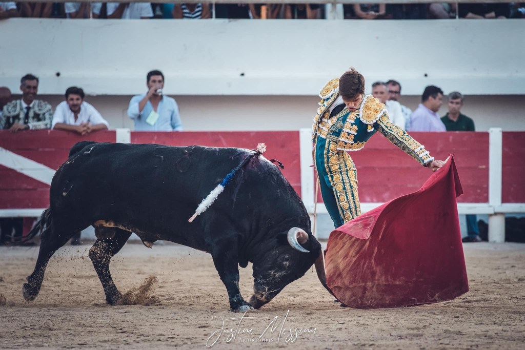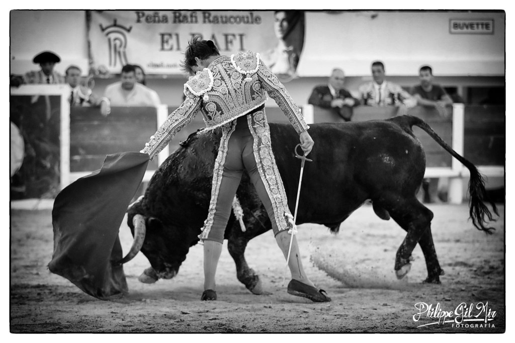 Lors de ce second combat, brindé au ganadero, c’est un Rafi beaucoup plus sûr de lui, de sa force et de sa muleta qui est apparu aux yeux de tous. En vrai lidiador, il a réussi à dominer les charges vibrantes, puissantes et enracées du toro « Estudioso », numéro 58, presque six ans et 620 kilos à la pesée, dans une faena initiée par des derechazos profonds et conclue par des naturelles de face émouvantes et pleine de sincérité. Pinchazo hondo, descabello, 2 oreilles pour le torero nîmois et vuelta posthume à ce très bon toro.