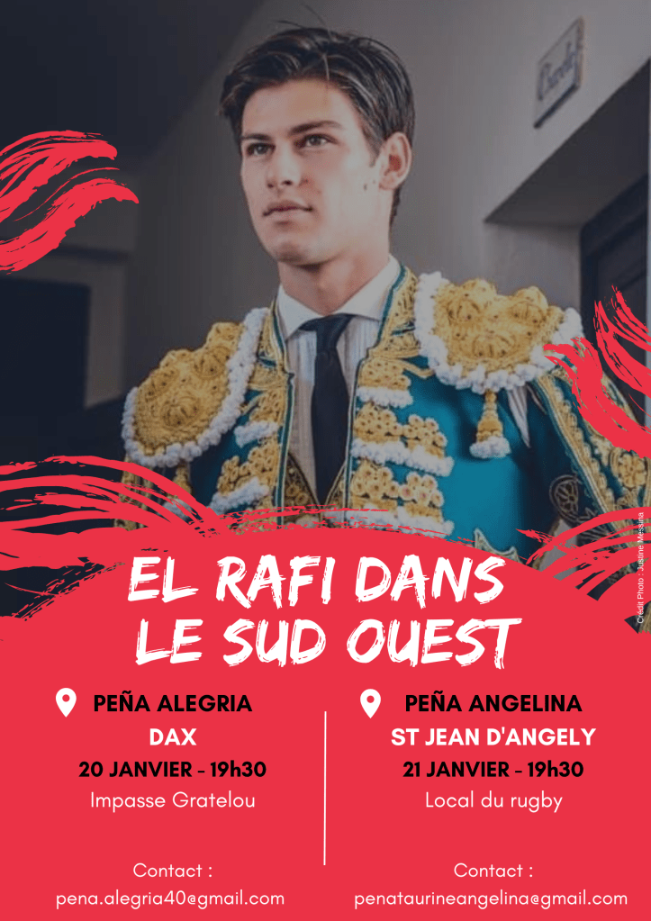 En janvier, El Rafi est invité par 2 Peñas du Sud Ouest. Le vendredi 20 janvier, il sera l’invité de la Péña Alegria de Dax et le samedi 21 janvier, il participera à la soirée de la Peña Angelina de Saint Jean d’Angély.