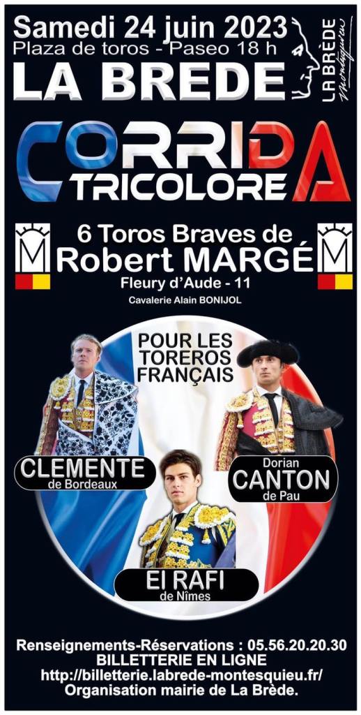 3 jeunes matadors de toros tricolores, Clément Dubecq « Clemente », Dorian Canton et El Rafi affronteront les toros de Robert Margé. Un cartel inédit dans ces arènes car les 3 toreros y feront leur présentation tout comme les toros des Monteilles.