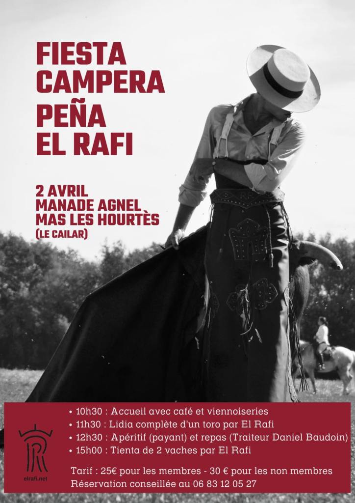 La date de la prochaine Fiesta Campera de la Peña El Rafi a été fixée au dimanche 2 avril à la Manade Agnel, au Mas Les Hourtès (30740 Le Cailar). Voici le programme de cette belle journée :