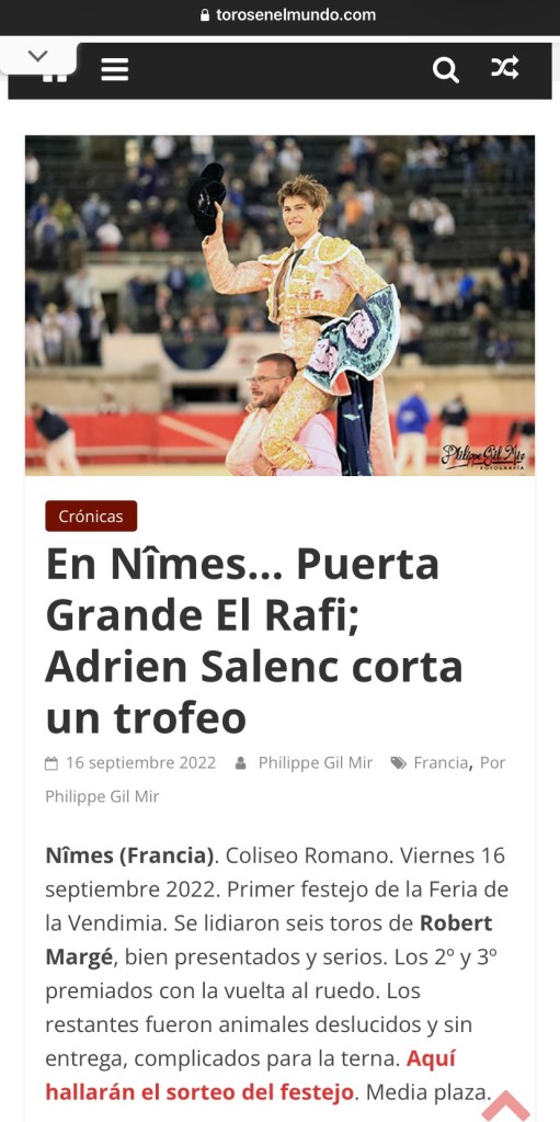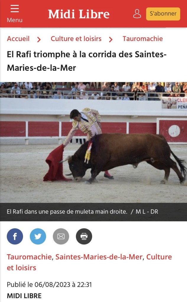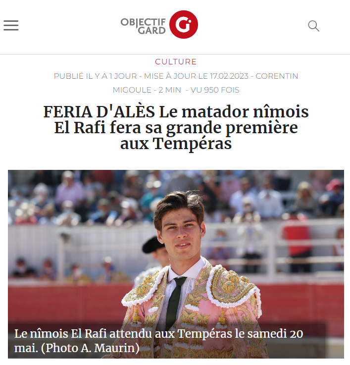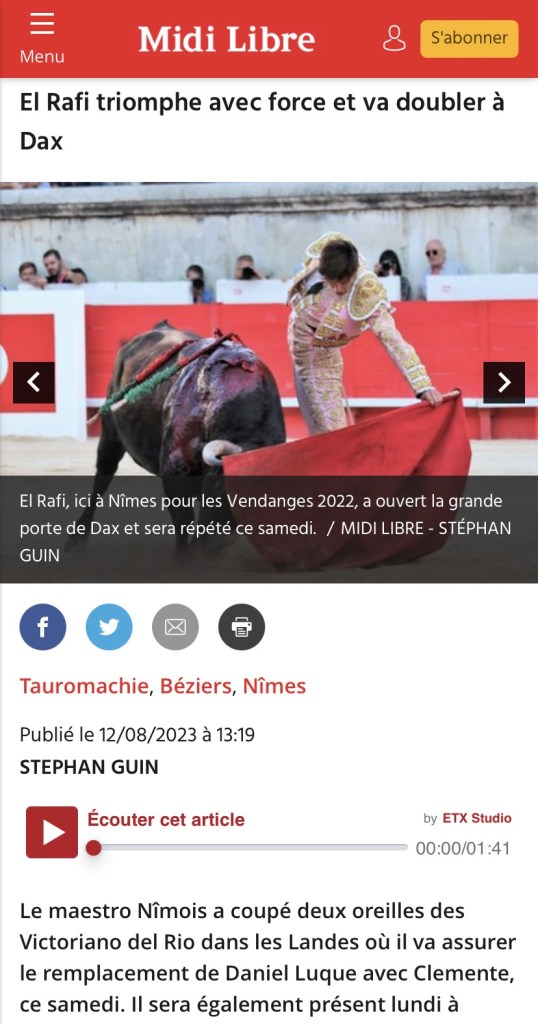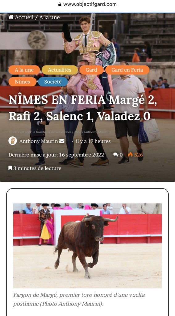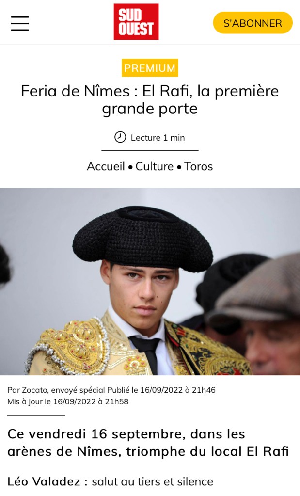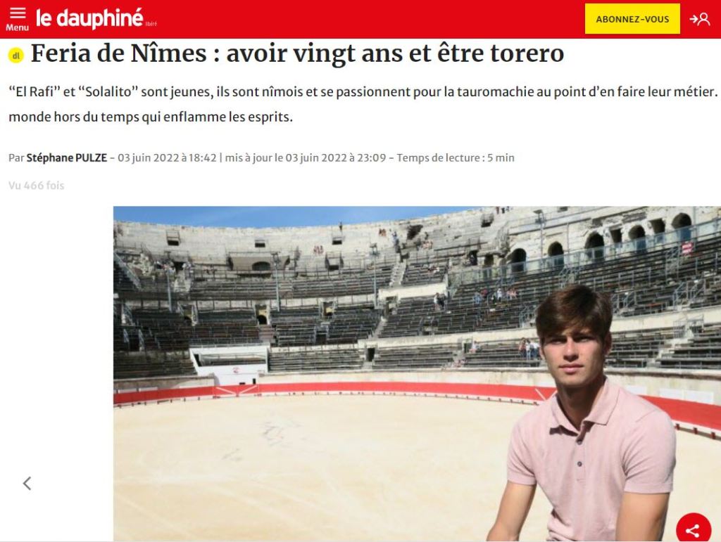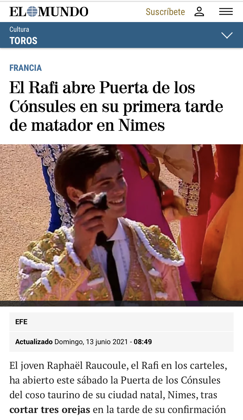 Et en version web : https://www.midilibre.fr/2021/04/13/lalternative-a-nimes-ou-a-arles-pour-le-matador-el-rafi-symboliquement-ca-change-tout-9484222.php